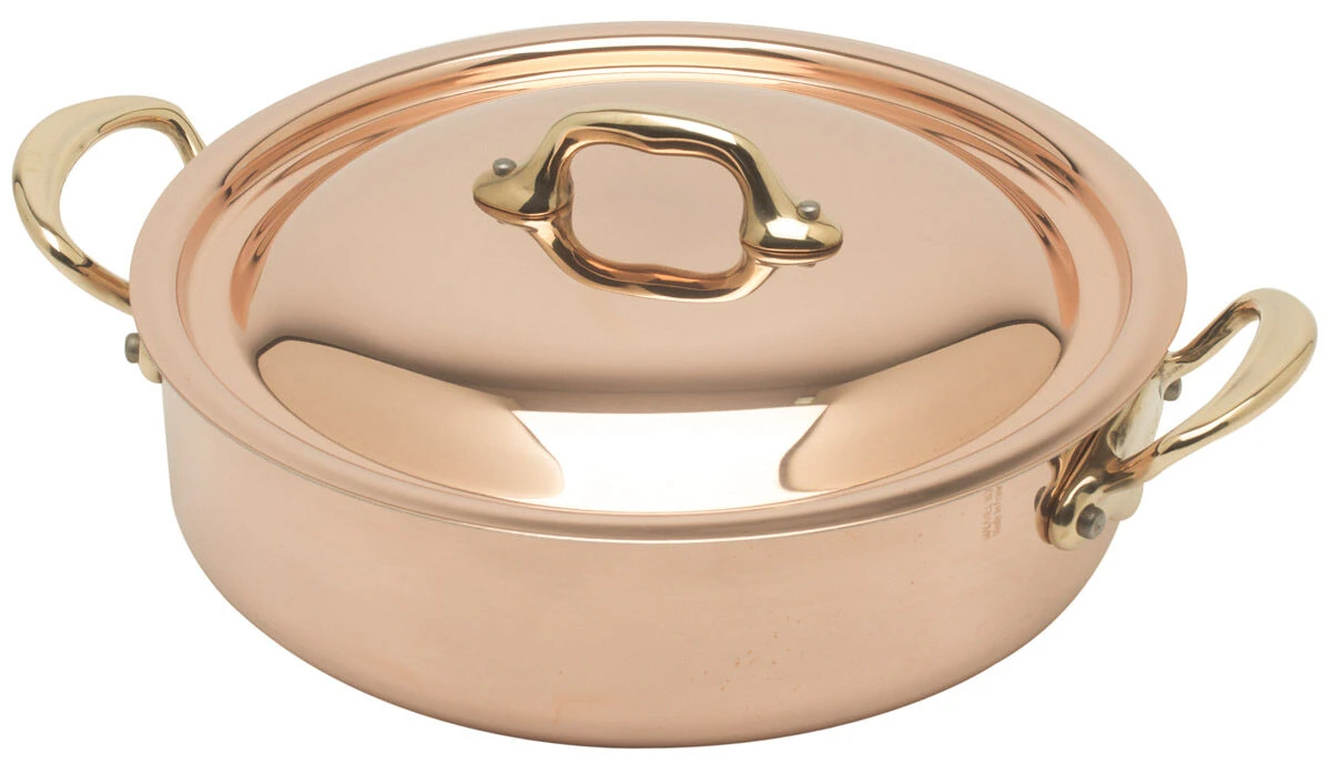 De Mauviel M’150B lage braadpan heeft een diameter van 24 cm en een inhoud van 2,9 liter. De pan is vervaardigd van 1,5 mm dik koper en is aan de binnenzijde voorzien van een laag roestvrij staal. De bronzen greep is tot een hoogglans gepolijst en met twee roestvrijstalen klinknagels aan de pan bevestigd. Gebruik de braadpan op het fornuis én in de oven voor het braden van vlees en bereiden van sauzen.