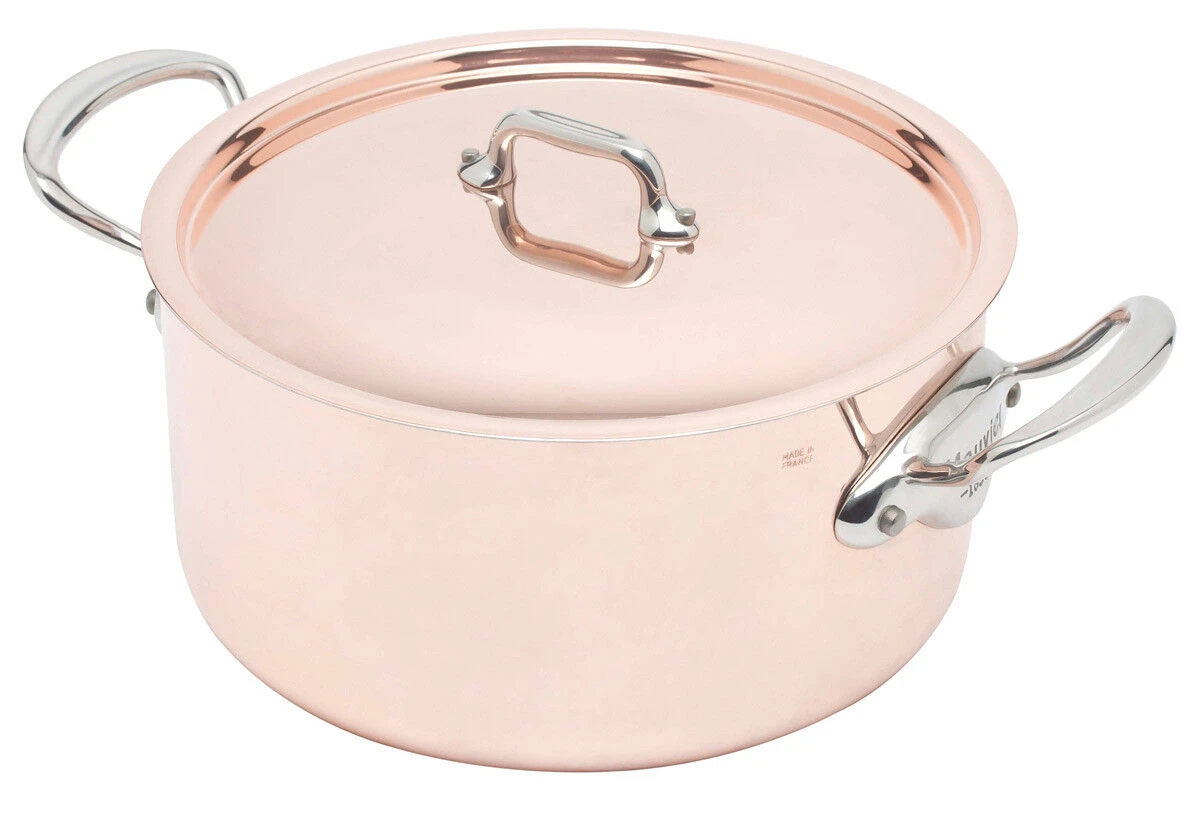 De Mauviel M’150S pannen zijn gemaakt van 1,5 mm dik massief koper. De pannen en deksels zijn aan de binnenzijde bekleed met een 0,1 mm laag roestvrij staal. Deze laag is slijtvast en bestand tegen hoge temperaturen, in tegenstelling tot de vroegere vertinde pannen, en voorkomt dat het koper de smaak van uw bereidingen nadelig beïnvloedt.
