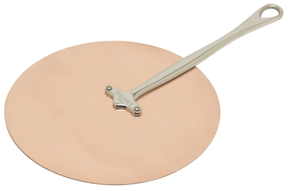 De universele Mauviel M’150S deksel past uitstekend op en bij pannen uit M’150S collectie. Door het vlakke ontwerp blijft de deksel liggen op zowel de kook-, sauteer- als koekenpannen. Met de lange steel kunt u de spatdeksel makkelijk over hete koekenpannen manoeuvreren.